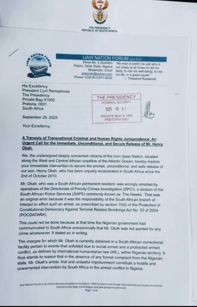October 1, 2025 – A Nigerian organization representing the Ijaw people, the dominant ethnic nationality in the country’s oil-rich Niger Delta, filed a petition to South African President Cyril Ramaphosa today, demanding the immediate release of jailed militant leader Henry Okah.